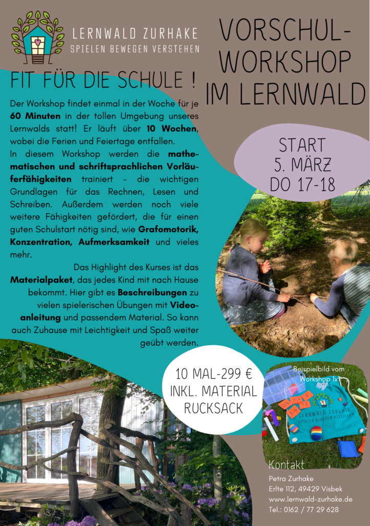 Das Besondere an unseren Workshops ist das Komplettparket: Die Kinder bekommen jedes Mal Übungen mit nach Hause, die genau beschrieben sind und mit einem QR-Code versehen sind. Dieser enthält einen Link zu einem Video, das die Übung oder das Spiel genau zeigt. Alle Materialien, die man für diese Übungen braucht, bekommt das Kind in einem Rucksack mit. Der Rucksack darf natürlich behalten werden! So kann Zuhause ohne viel Aufwand weitergespielt werden und die Eltern erfahren genau, wie sie ihr Kind spielerisch fördern können.