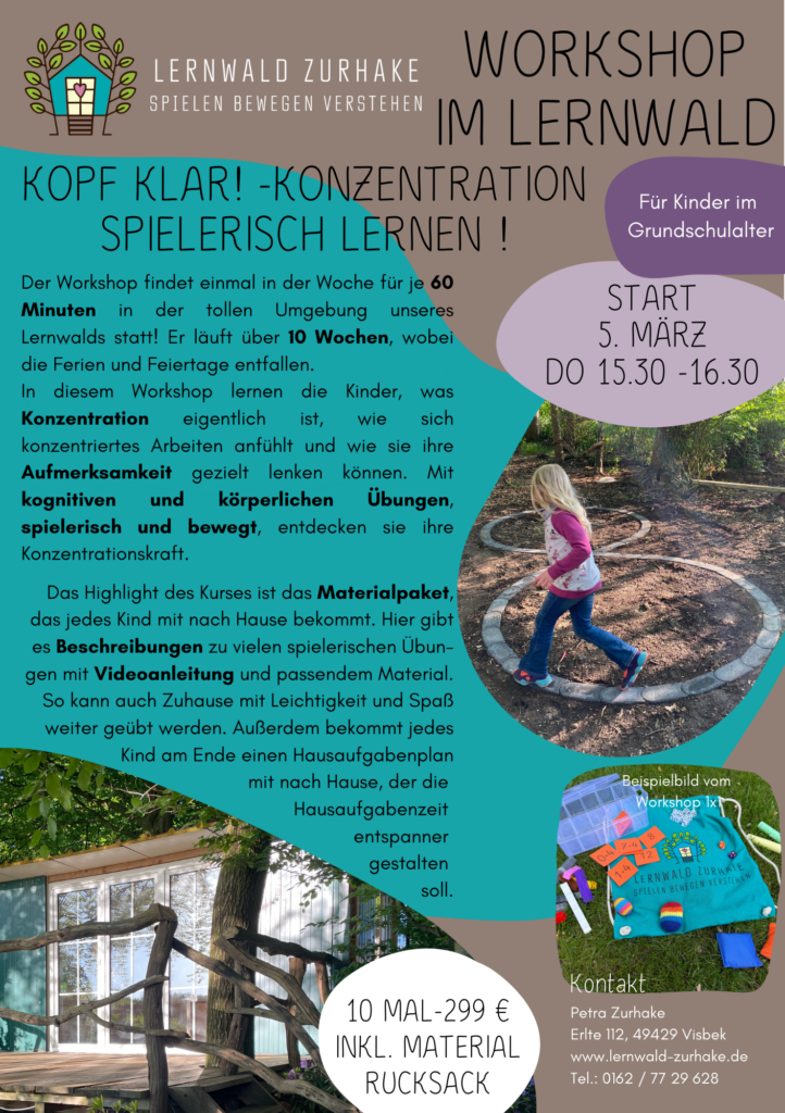 Konzentration ist für viele Kinder gar nicht so leicht – aber man kann sie trainieren! In diesem Workshop lernen Kinder, was Konzentration eigentlich ist, wie sich konzentriertes Arbeiten anfühlt und wie sie ihre Aufmerksamkeit gezielt lenken können. Mit kognitiven und körperlichen Übungen, spielerisch und bewegt, entdecken sie ihre Konzentrationskraft. Jedes Kind entwickelt ein eigenes Konzentrationsheft mit Übungen, die es selbst gestaltet – für den Alltag und die Schule.